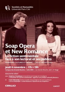 Delphine Chedaleux (Université de Technologie de Compiègne) et Louis Gabrysiak (Centre européen de sociologie et de science politique), viendront présenter leurs travaux autour d’une thématique « Soap Opera et New Romance : la fiction sentimentale face à son lectorat et ses publics » (voir l’affiche en pièce jointe).
